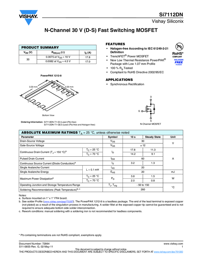 Trans MOSFET N-CH 30V 11.3A 8-Pin PowerPAK 1212 T/R