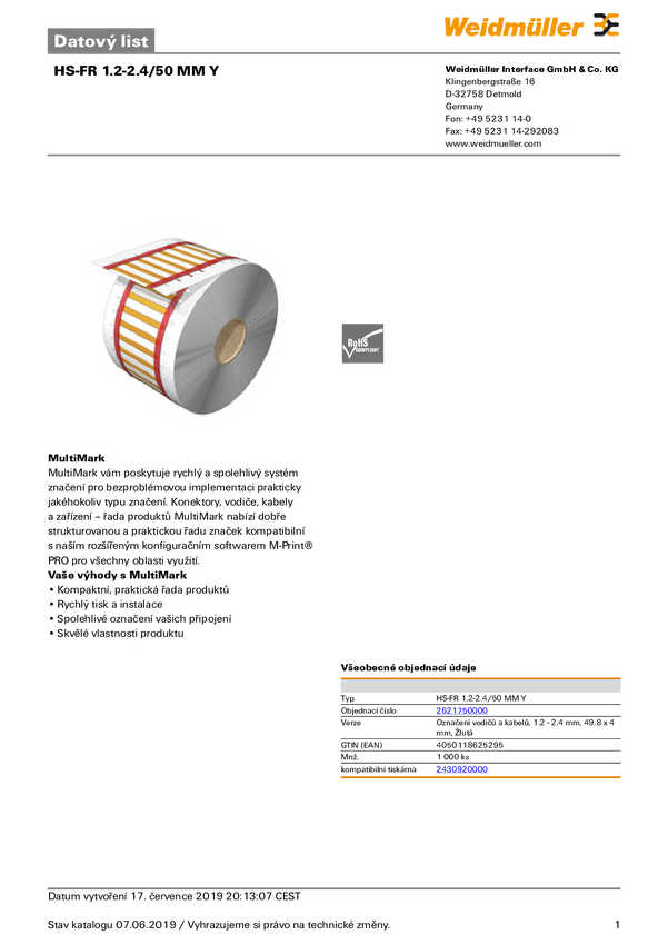 Weidmüller 2621750000 HS-FR 1.2-2.4/50 MM Y System znakowania kabli Pole powierzchni etykietowania: 49.8 x 4 mm żółty Il