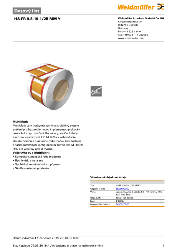 Weidmüller 2621690000 HS-FR 9.5-19.1/25 MM Y Tabliczka znamionowa Pole powierzchni etykietowania: 24.9 x 30.4 mm żółty