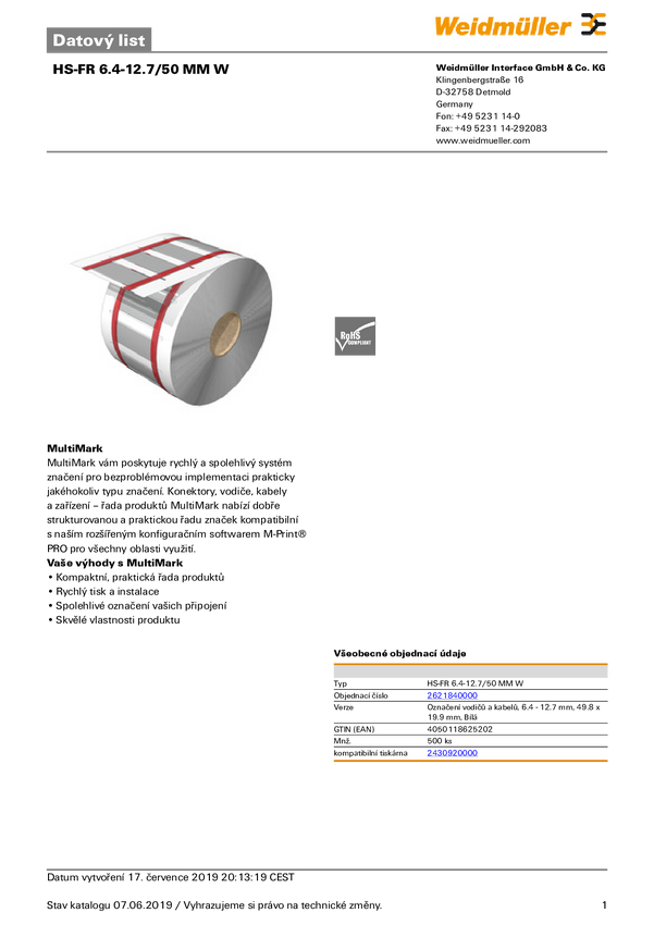 Weidmüller 2621840000 HS-FR 6.4-12.7/50 MM W Tabliczka znamionowa Pole powierzchni etykietowania: 49.8 x 19.9 mm biały I