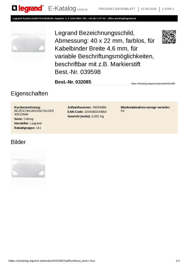Legrand 032085 Legrand 032085 Tabliczka do etykietowania Pole powierzchni etykietowania: 40 x 22 mm biały 100 szt.