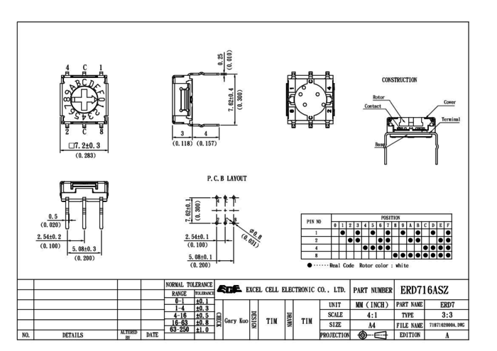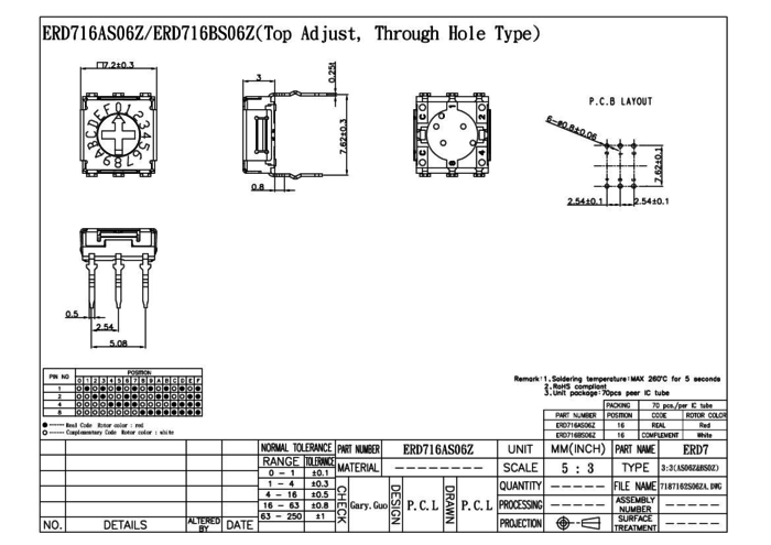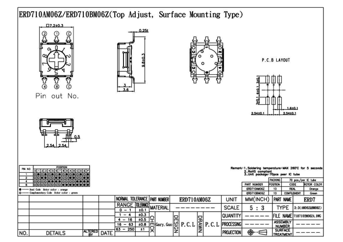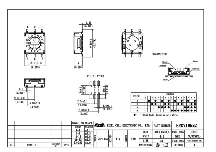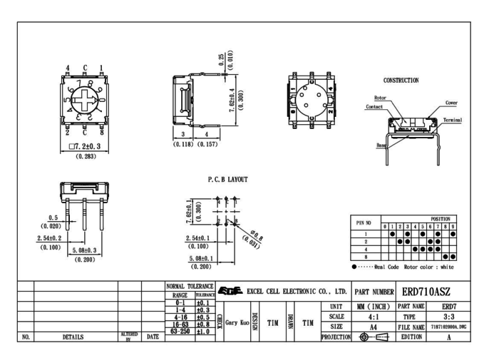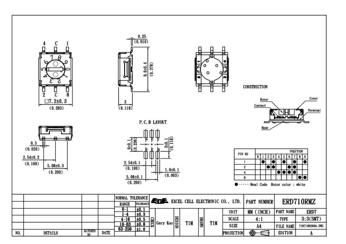 Miniaturowy przełącznik suwakowy, poziomy, , w każdym położeniu wyprowadzenia skrajne zwarte z wybraną parą styków, do wlutowania w obwód drukowany