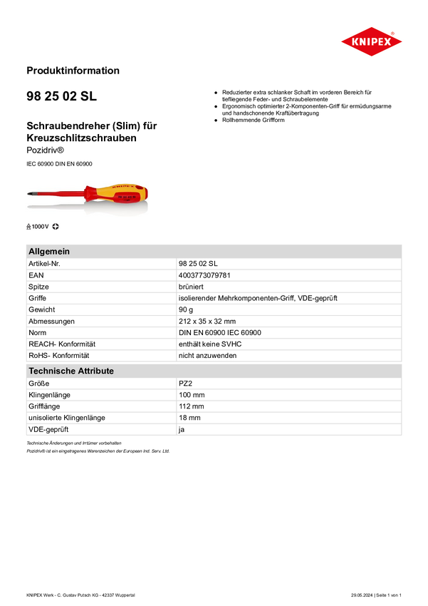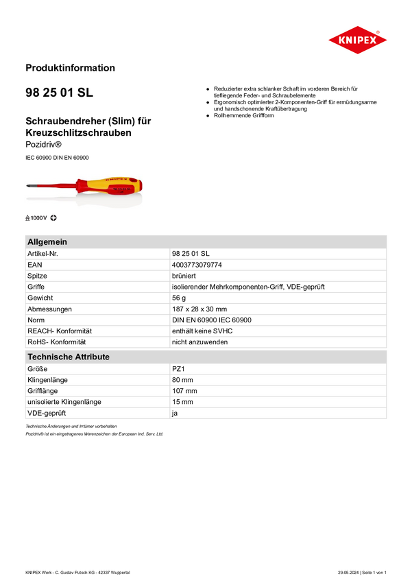 Wkrętak krzyżowy PZ 1 Knipex Pozidriv® 98 25 01 SL