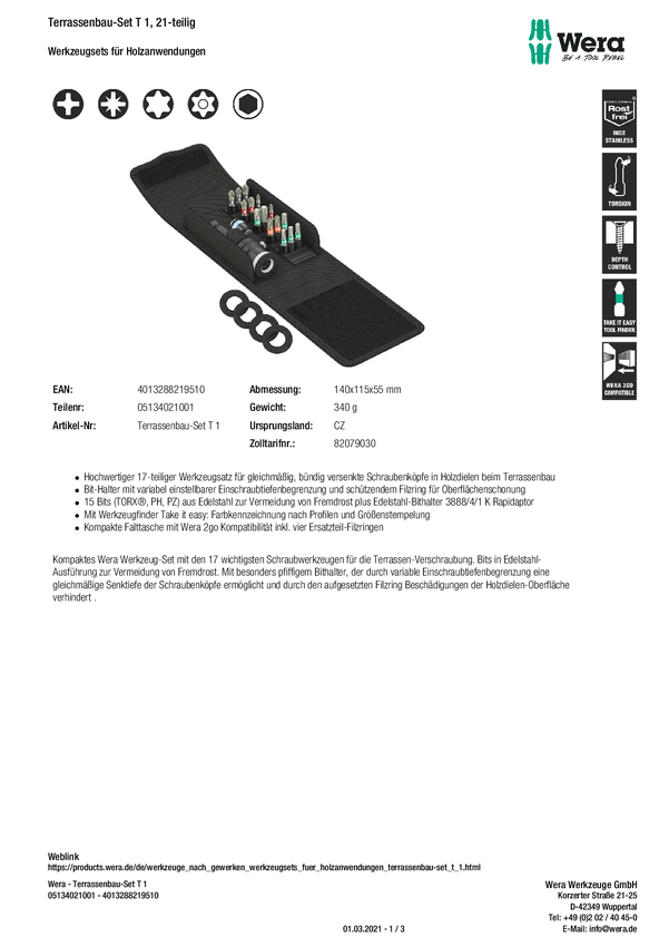 Bity Wera T 1 05134021001 1 szt. wewnętrzny sześciokąt, krzyżakowy Pozidriv, krzyżakowy Phillips, TORX