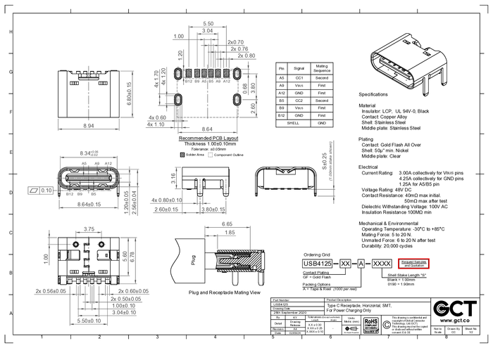 Złącze; USB C; gniazdo; Fully SMT; PIN: 16; pozioma; top board mount; 5A; 48V; USB4110-GF-A; GCT