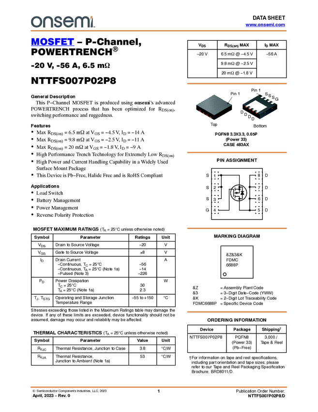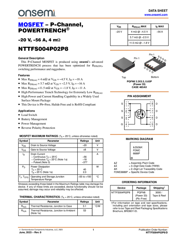 Power MOSFET, Single, P-Channel, -20V, -56A, 4mΩ, PQFN8 3x3