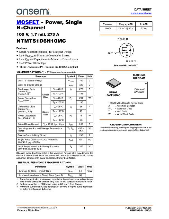 Single N-Channel Power MOSFET 100V, 273A, 1.7mΩ, PQFN 8x8