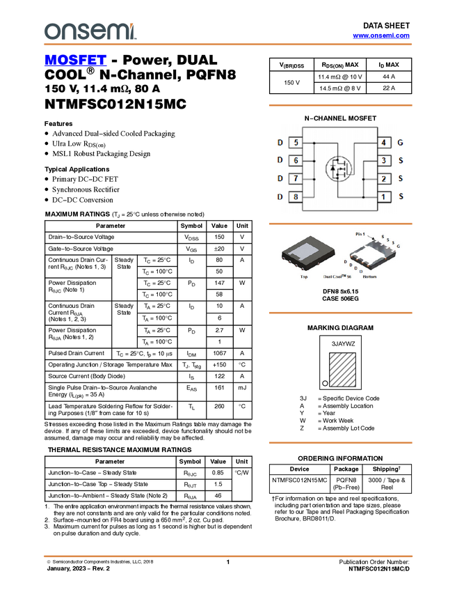 MOSFET - Power, Dualcool N-Channel, PQFN8, 150V, 11.4mΩ, 80A