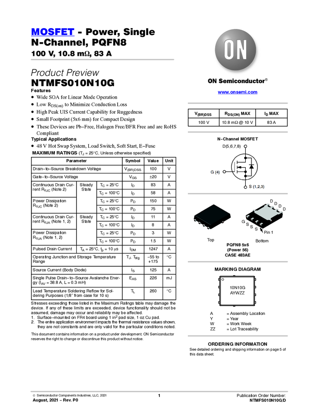 MOSFET - Power, Single, N-Channel, PQFN8, 100V, 10.8mΩ, 83A
