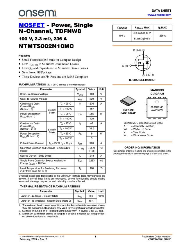 Single N-Channel Power MOSFET 100V, 194 A, 2 mΩ, PQFN 8x8