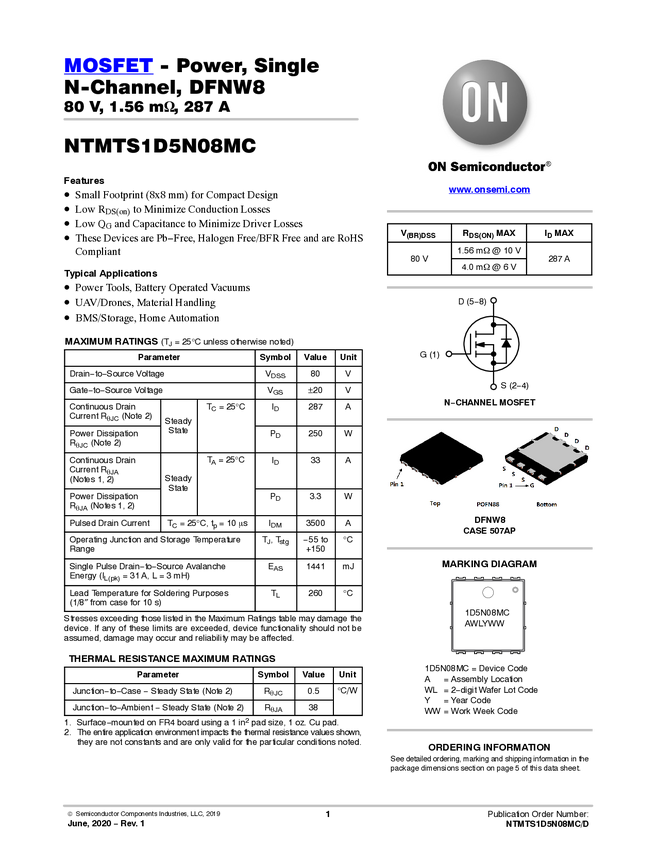Single N-Channel Power MOSFET 80V, 287A, 1.56mΩ, PQFN 8x8