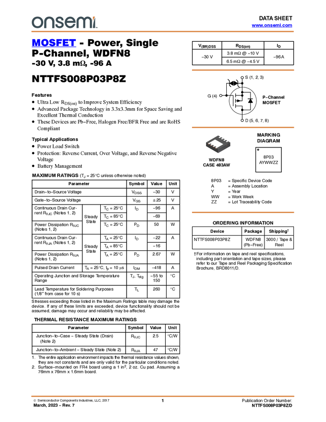 MOSFET, Power 30V P-Channel PQFN8 3.3X3.3
