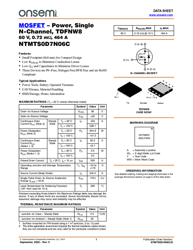 Single N-Channel Power MOSFET 60V, A, 0.72mΩ, PQFN 8x8