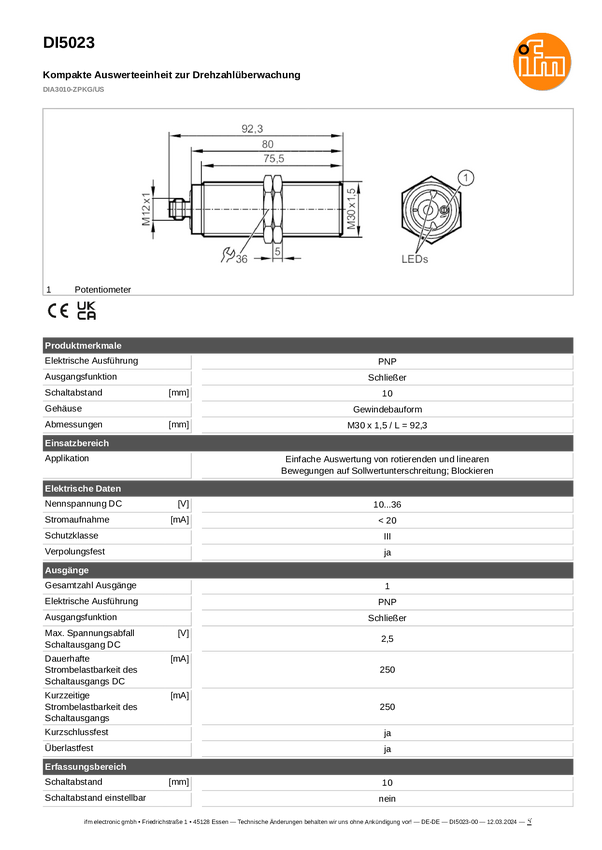 Kontroler prędkości obrotowej DI5023 ifm Electronic 1 szt.