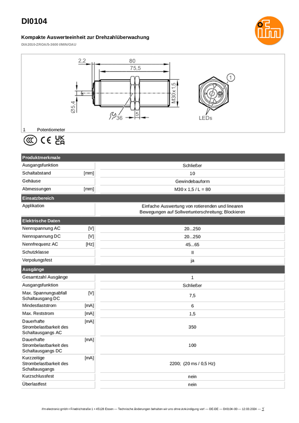 Kontroler prędkości obrotowej DI0104 ifm Electronic 1 szt.