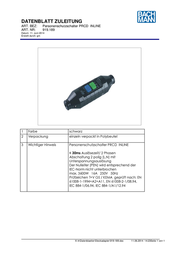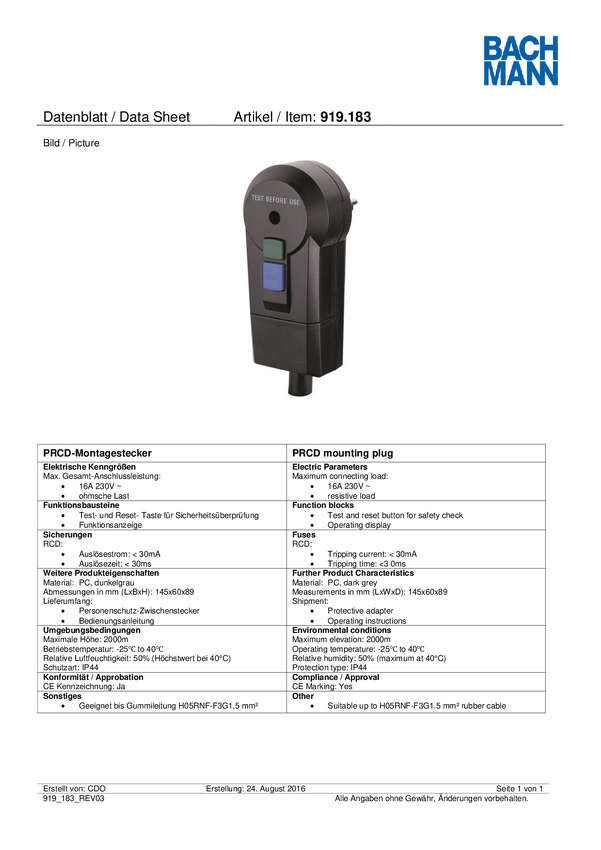 Bachmann 919.183 Adapter ochrony osobistej PRCD 230 V czarny IP44