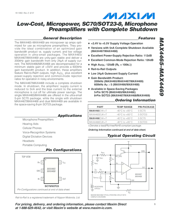 MAX4468 Low-Cost, Single, Microphone Preamplifier with Complete Shutdown