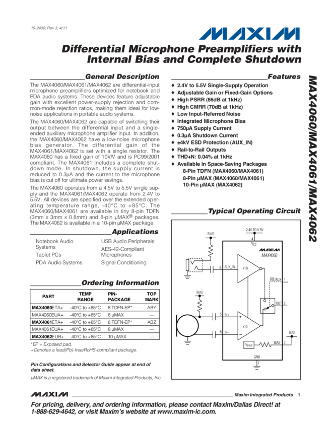 MAX4062 Differential Mic Preamp with Internal Bias and Complete Shutdown