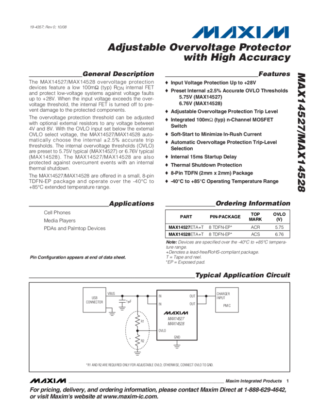 MAX14528 Overvoltage Protection with adjustable trip level or optional preset trip voltage of 6.76V