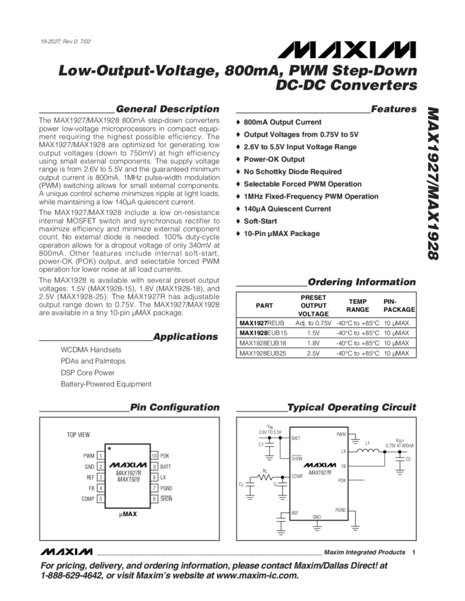 MAX1928 Preset Low-Voltage, 800mA 1MHz Step-Down DC-DC Converter