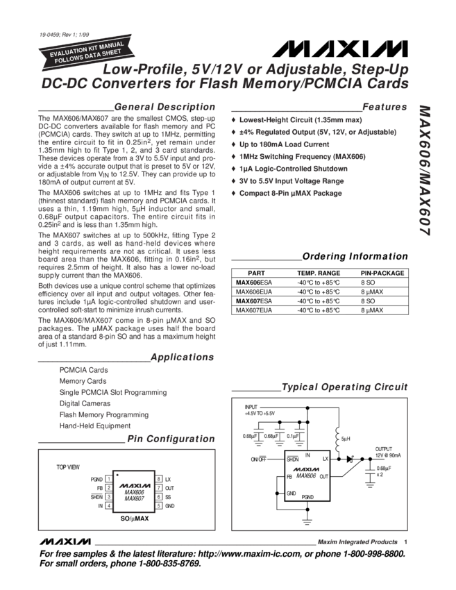 MAX606, MAX607 Low-Profile, 5V/12V or Adjustable, Step-Up DC-DC Converter for Flash Memory PCMCIA Cards