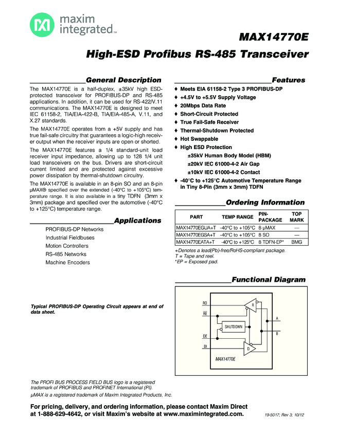 MAX14770E High-ESD PROFIBUS RS-485 Transceiver