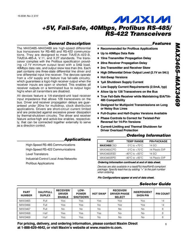 MAX3465, MAX3466, MAX3467, MAX3468, MAX3469 +5V, Fail-Safe, 40Mbps, PROFIBUS RS-485/RS-422 Transceivers