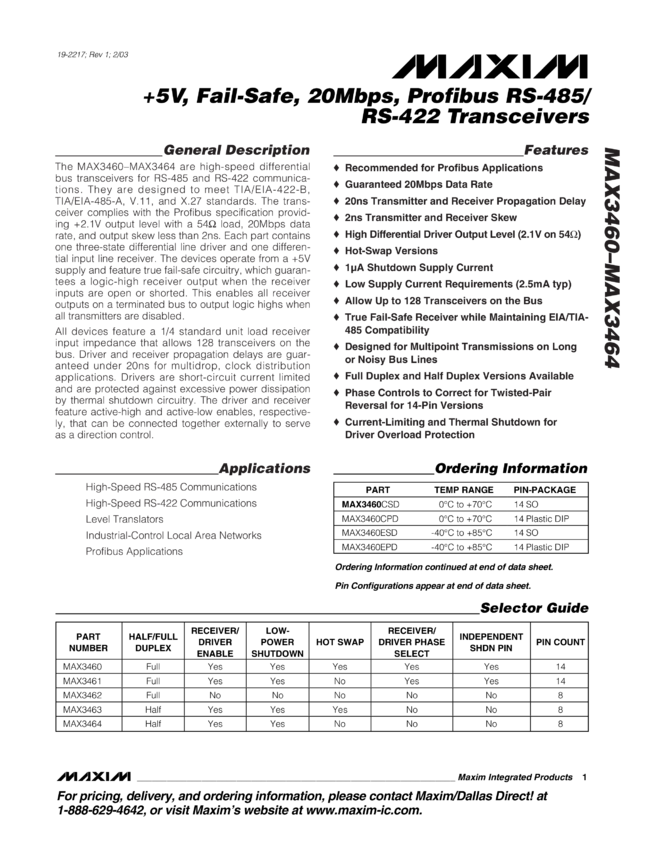 MAX3460, MAX3461, MAX3462, MAX3463, MAX3464 +5V, Fail-Safe, 20Mbps, PROFIBUS RS-485/RS-422 Transceivers