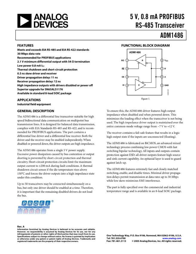 ADM1486: 5 V, High Speed (30 Mbps), Low Power, Half Duplex RS-485 PROFIBUS Transceiver