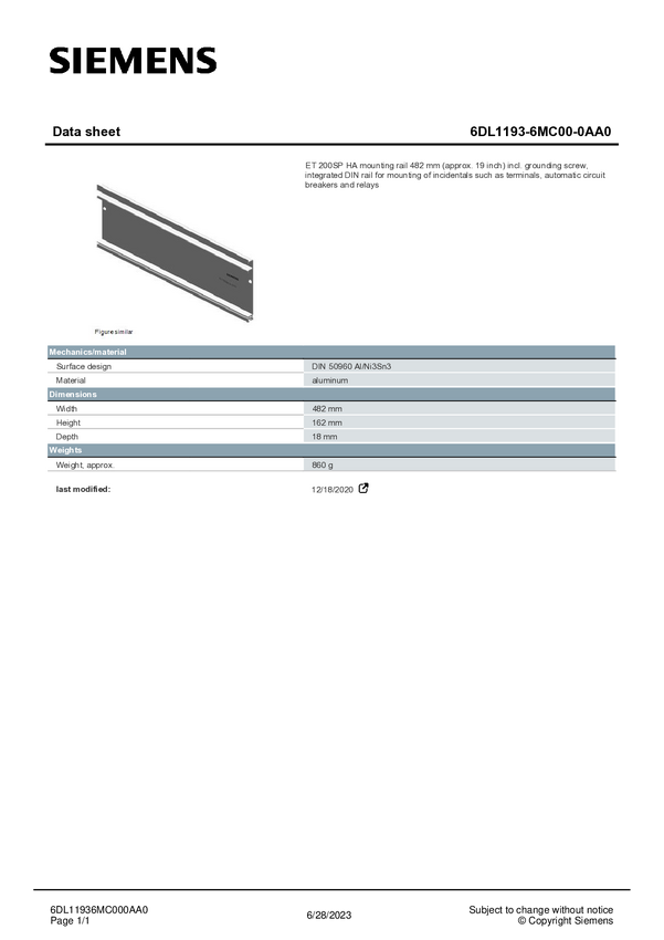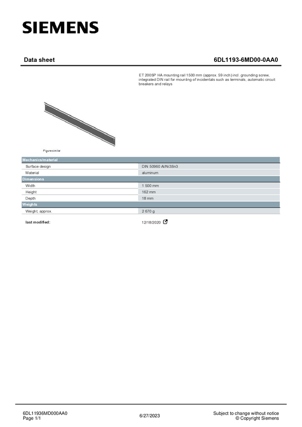 Szyna profilu PLC Siemens 6DL1193-6MD00-0AA0 6DL11936MD000AA0