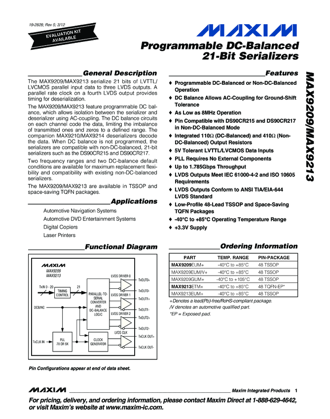 MAX9209, MAX9213 Programmable DC-Balanced 21-Bit Serializers
