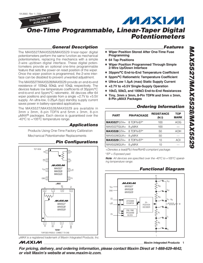 MAX5527, MAX5528, MAX5529 64-Tap, One-Time Programmable, Linear-Taper Digital Potentiometers