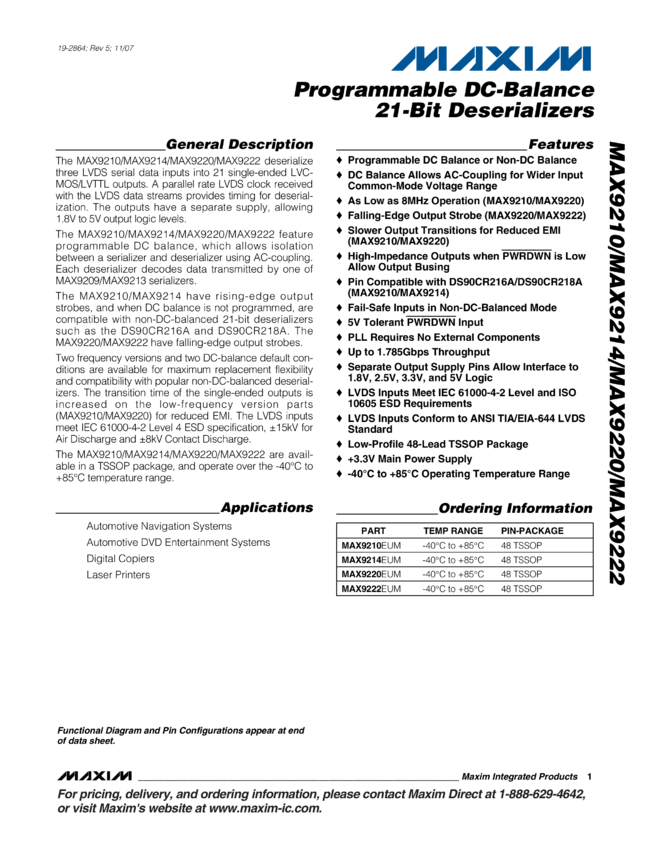 MAX9210, MAX9214, MAX9220, MAX9222 Programmable DC-Balance 21-Bit Deserializers