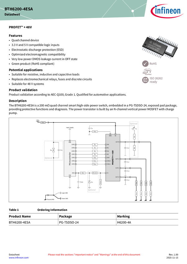 RDS(on) @ Tj = 25°C: 200 mΩ | 4 channels | Vs (extended) = 60V | PRO-SIL™ ISO 26262-ready The BTH6200-4ESA, as part of the PROFET™ + 48V family, features 4 channels with proportional analog current sense. This 200 mΩ quad-channel device is suitable for a 48 V board net. It comes in a TSDSO-24 exposed pad package offering protection and diagnostic functions.