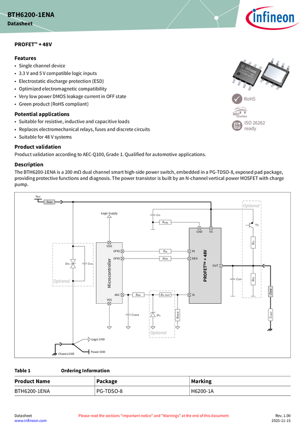 RDS(on) @ Tj = 25°C: 100 mΩ | 2 channels | Vs (extended) = 60V | PRO-SIL™ ISO 26262-ready The BTH6100-2EPA, as part of the PROFET™ + 48V family, features 2 channels with proportional analog current sense. This 100 mΩ dual-channel device is suitable for a 48 V board net. It comes in a small TSDSO-14 exposed pad package and is footprint compatible with family members, offering protection and diagnostic functions.