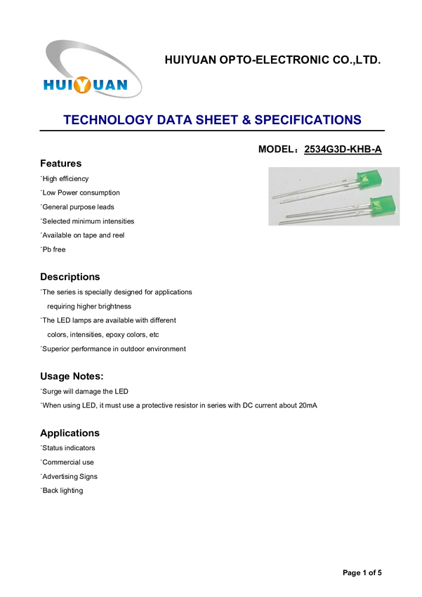 HuiYuan 2534G3D-KHB-A Dioda LED THT zielony prostokątny 2 x 5 mm 550 mcd 120 ° 20 mA