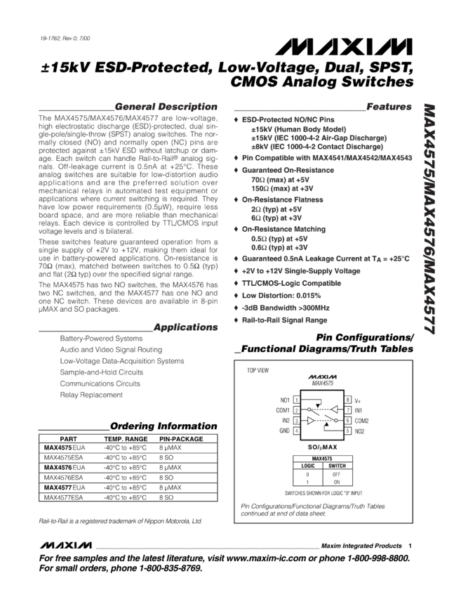 MAX4575, MAX4576, MAX4577 ±15kV ESD-Protected, Low-Voltage, Dual, SPST, CMOS Analog Switches