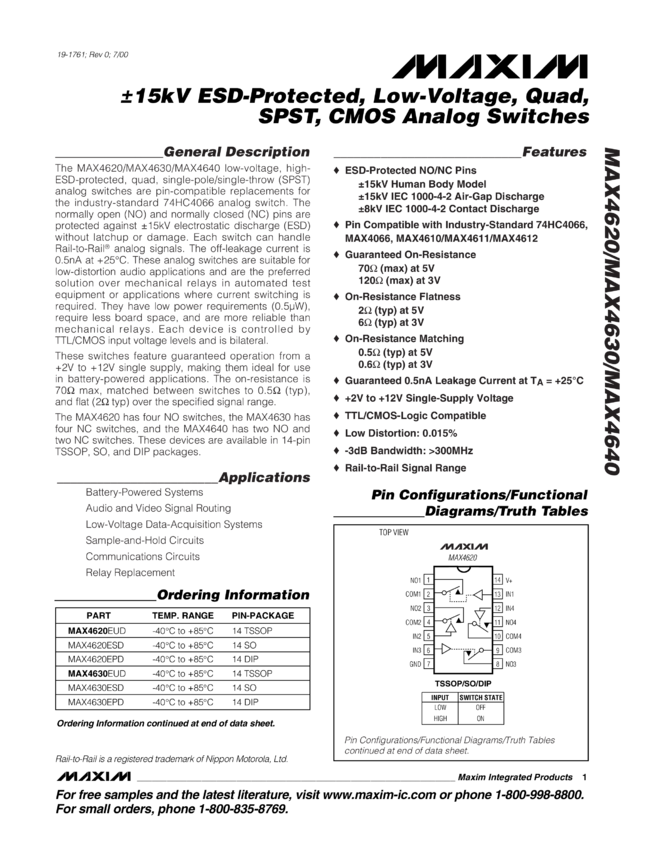 MAX4620, MAX4630, MAX4640 ±15kV ESD-Protected, Low-Voltage, Quad, SPST, CMOS Analog Switches