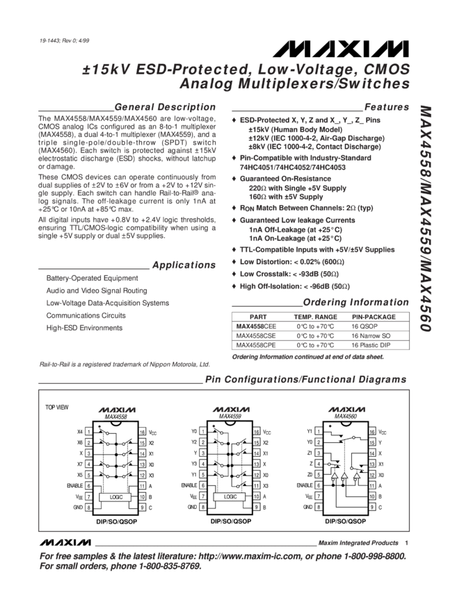 MAX4558, MAX4559, MAX4560 ±15kV ESD-Protected, Low-Voltage, CMOS Analog Multiplexers Switches