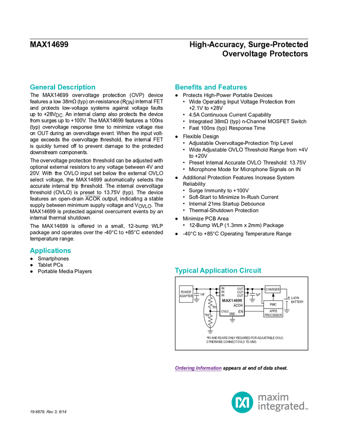 MAX14670, MAX14671, MAX14672, MAX14673 Bidirectional Current-Blocking, High-Input Overvoltage Protectors with Adjustable OVLO