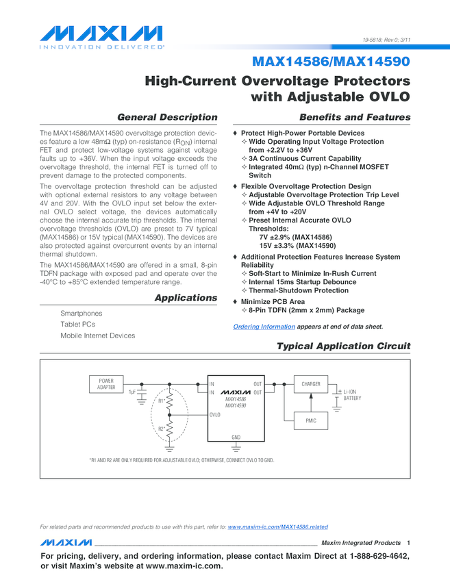 MAX14590 High Current Overvoltage Protectors with Adjustable OVLO
