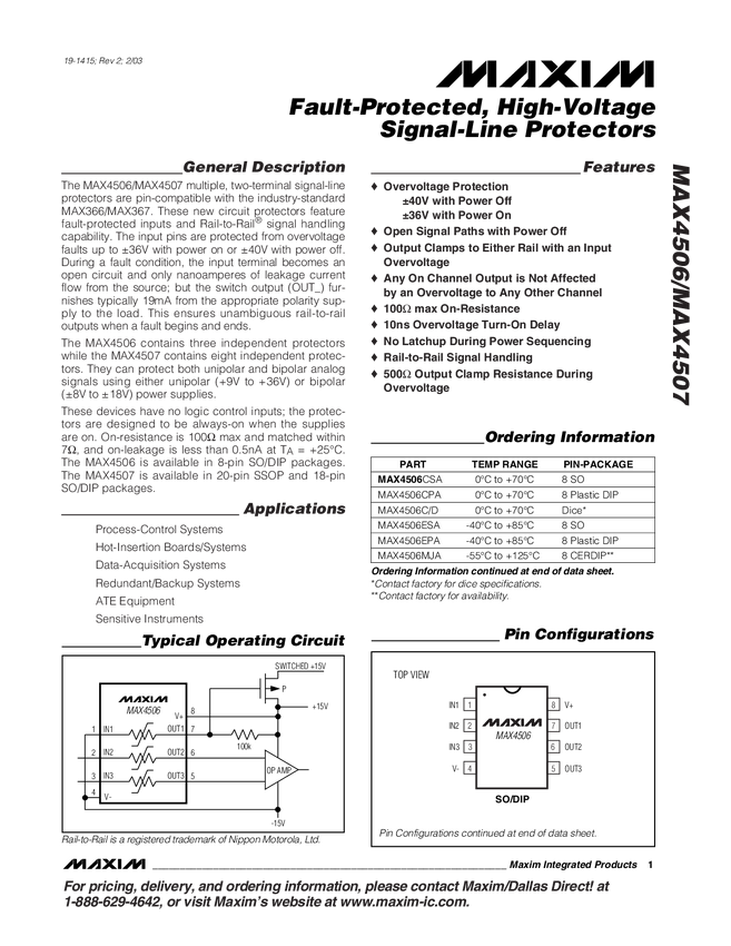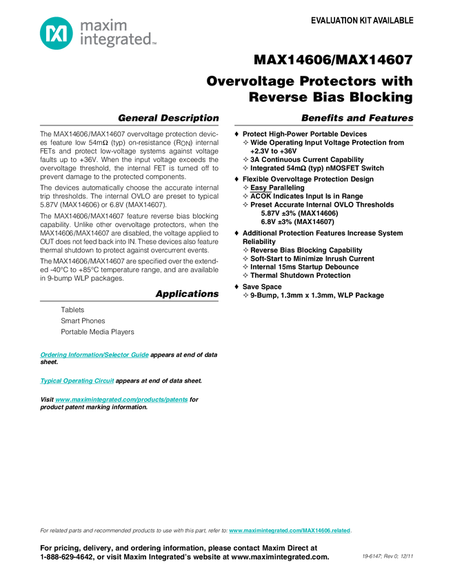 MAX14606, MAX14607 Overvoltage Protectors with Reverse Bias Blocking