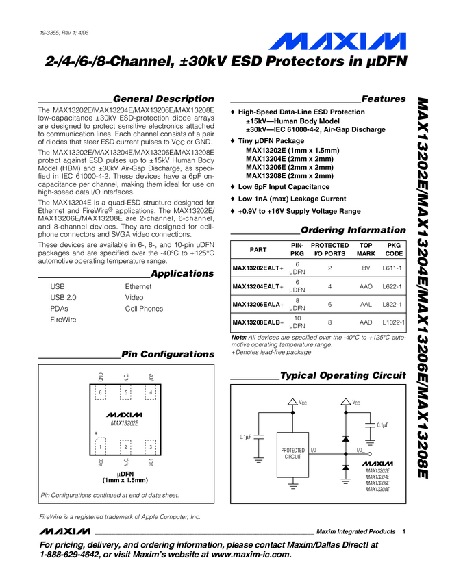 2-/4-/6-/8-Channel ±30kV ESD Protectors in µDFN