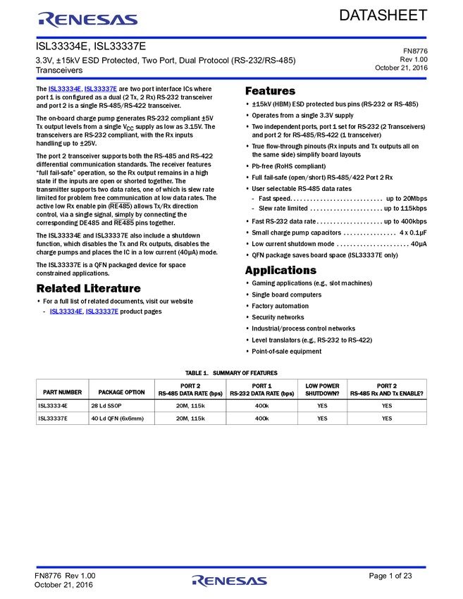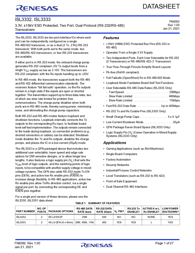 3.3V, ±15kV ESD Protected, Two Port, Dual Protocol (RS-232/RS-485) Transceivers