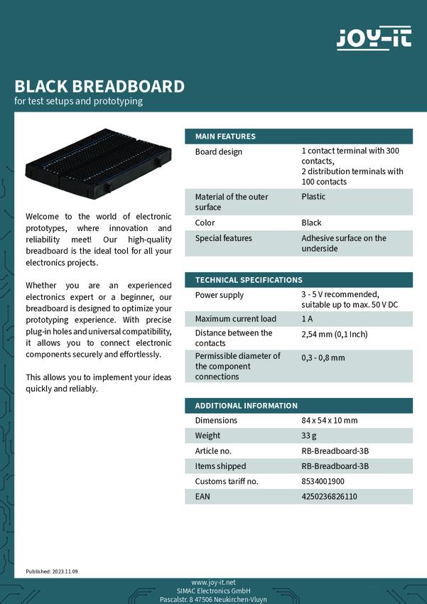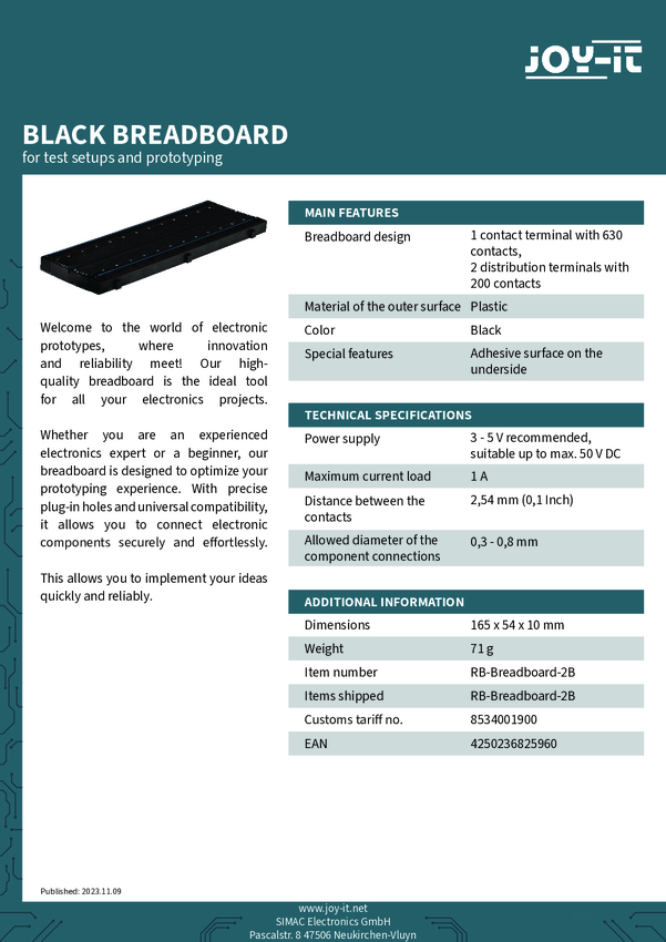 Płytka stykowa prototypowa Joy-it RB-Breadboard2-B RB-Breadboard2-B samoprzylepne Ilość pinów 830 1 szt.