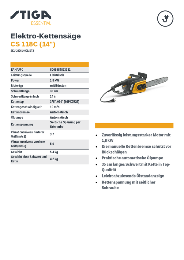 STIGA CS 118c 14" elektryczny Piła łańcuchowa 1800 W Długość prowadnicy 350 mm
