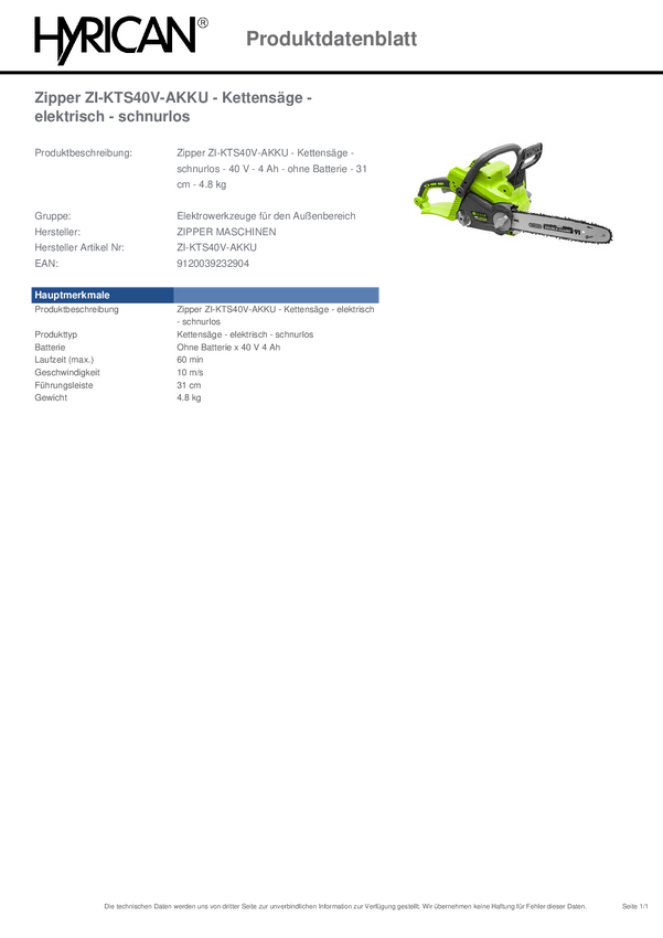 Zipper ZI-KTS40V-AKKU akumulatorowy Piła łańcuchowa bez akumulatora 40 V Długość prowadnicy 310 mm