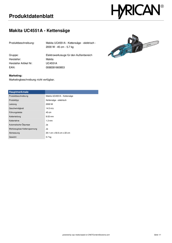 Makita elektryczny Piła łańcuchowa 2000 W 230 V Długość prowadnicy 450 mm