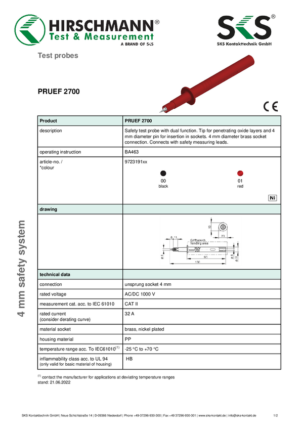 Zabezpieczona końcówka pomiarowa złącze wtykowe, 4 mm CAT II 1000 V czarny SKS Hirschmann PRUEF 2700 sw