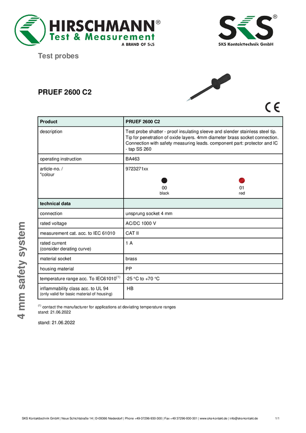 Zabezpieczona końcówka pomiarowa złącze wtykowe, 4 mm CAT II 1000 V czarny SKS Hirschmann PRUEF 2600 C2 sw